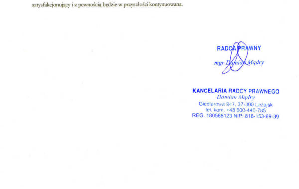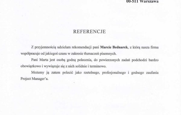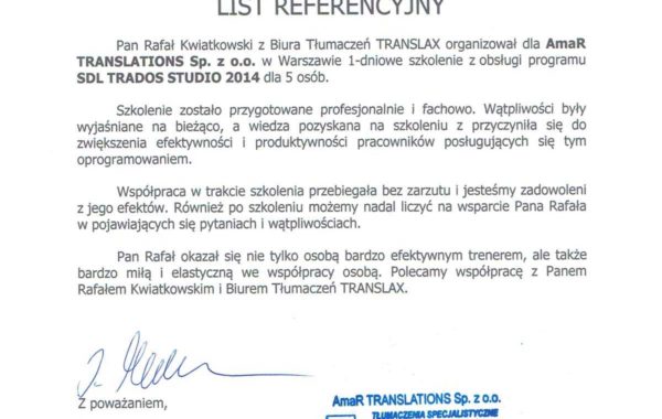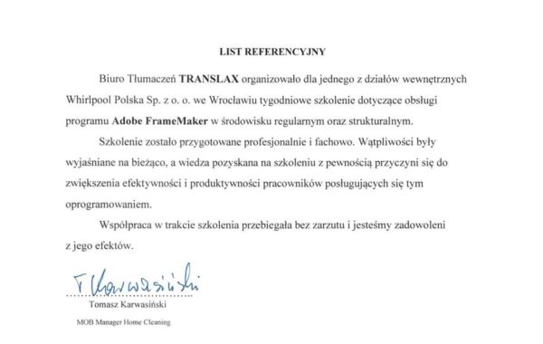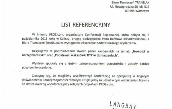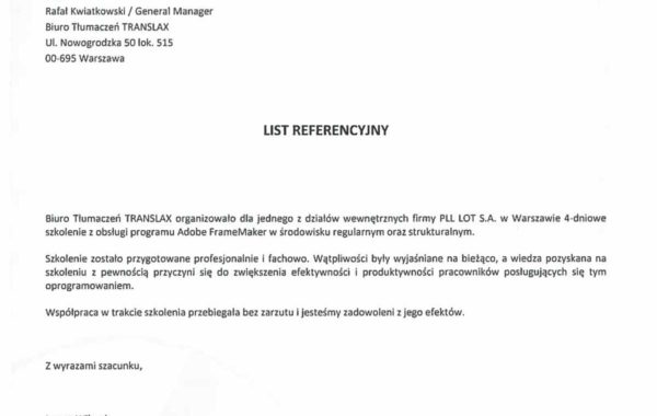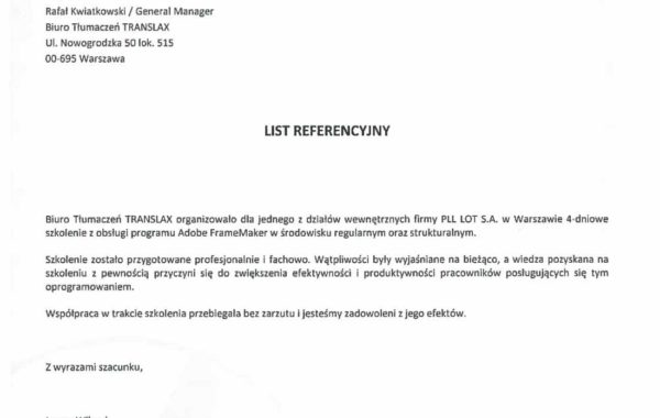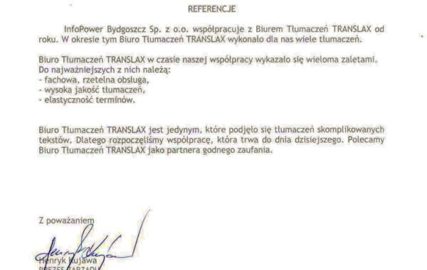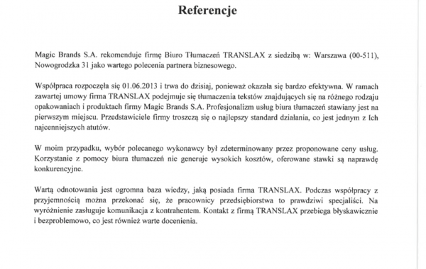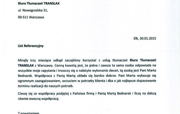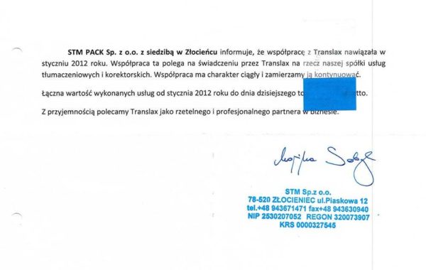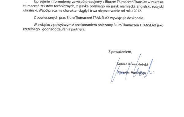 „Profesjonalizm usług biura tłumaczeń stawiany jest na pierwszym miejscu. Przedstawiciele firmy troszczą się o najlepszy standard działania, co jest jednym z Ich najcenniejszych atutów. W moim przypadku, wybór polecanego wykonawcy był zdeterminowany przez proponowane ceny usług. Wartą odnotowania jest ogromna baza wiedzy, jaką posiada firma TRANSLAX. Podczas współpracy z przyjemnością można przekonać się, że pracownicy przedsiębiorstwa to prawdziwi specjaliści.”