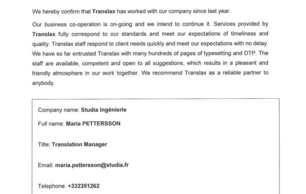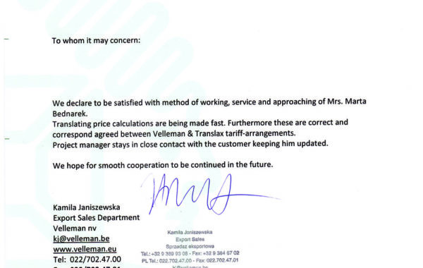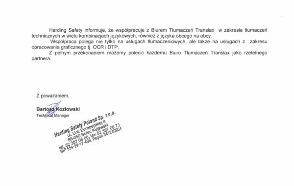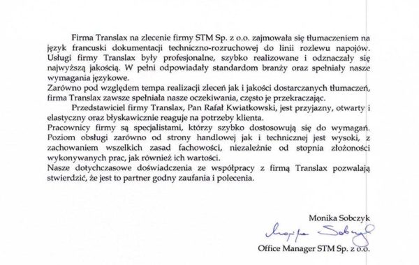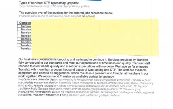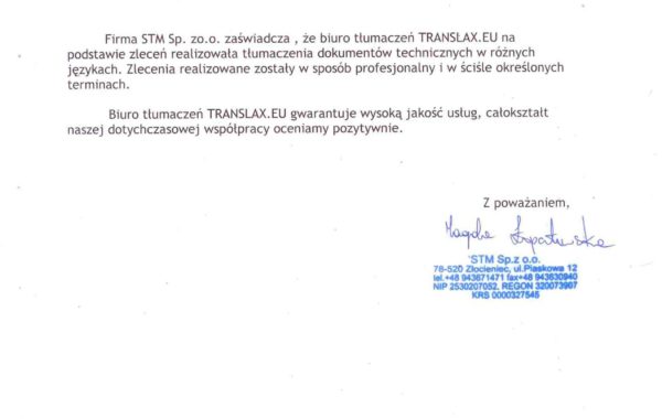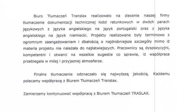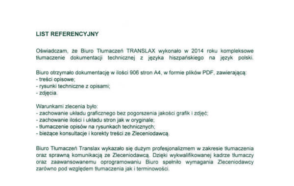 „Biuro Tłumaczeń Translax wykonało kompleksowe tłumaczenie dokumentacji technicznej z języka hiszpańskiego na język polski. Biuro Tłumaczeń Translax wykazało się dużym profesjonalizmem w zakresie tłumaczenia oraz sprawną komunikacją. Biuro Tłumaczeń Translax otrzymało 906 stron A4, w formie plików PDF. Dzięki wykwalifikowanej kadrze tłumaczy oraz zaawansowanemu oprogramowaniu Biuro spełniło wymagania Zleceniodawcy zarówno pod względem tłumaczenia jak i terminowości.”