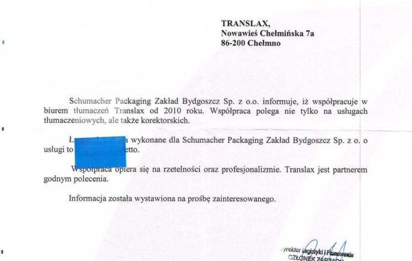 Schumacher Packaging Zakład Bydgoszcz Sp. z o.o. informuje, iż współpracuje w biurem tłumaczeń Translax od 2010 roku. Współpraca polega nie tylko na usługach tłumaczeniowych, ale także korektorskich. Współpraca opiera się na rzetelności oraz profesjonalizmie. Biuro Tłumaczeń Translax jest partnerem godnym polecenia.